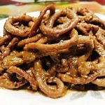 Heat the pan and fry the intestines until lightly crisp then pour-in the sauce on pan and simmer for another 5 minutes.