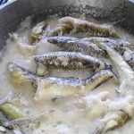 In a pan, mix onion, 1 thumb of sliced ginger, and goby, and season with salt, ground black pepper, green chili, 1 thumb of sliced ginger, and vinegar.
